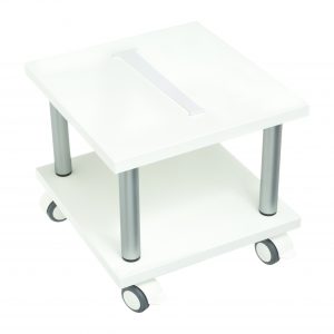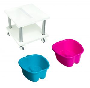 With its smooth-running castors, the foot tub trolley can be easily moved from the filling station to the customer. The brakes on the castors ensure a secure stand at the treatment centre. The high-quality coating of the wooden platform is water-repellent and resistant to disinfectants. The trays can be treated directly with disinfectant or alternatively covered with disposable hygiene bags (Art. 6753). The trolley is supplied fully assembled and with 2 trays. The colours of the trays can be freely selected. The trays are held firmly on the platform by a locking mechanism.  Manufacture: “Made in Germany”.